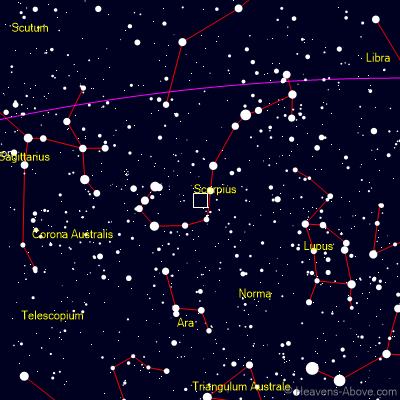 Arriba: Detalle de ubicación. Campo de visión a 2º grados con estrellas hasta magnitud 12. Crédito: Heavens-Above.com.